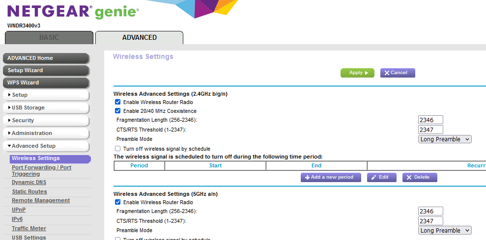 If for some reason you still want to turn off 5 GHz (not recommended) you need to switch to advanced mode by clicking on the advanced tab under the Netgear Genie logo, click on Advanced Setup from the left menu then click Wireless Settings. Untick the 'Enable Wireless Router Radio' box in the 5 GHz section then hit the green 'Apply' button at the top.